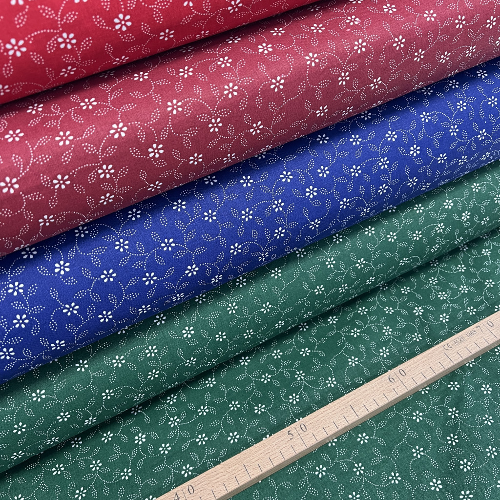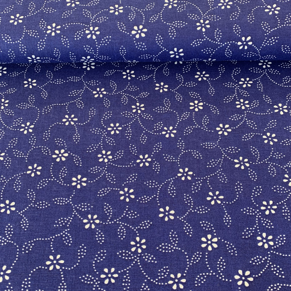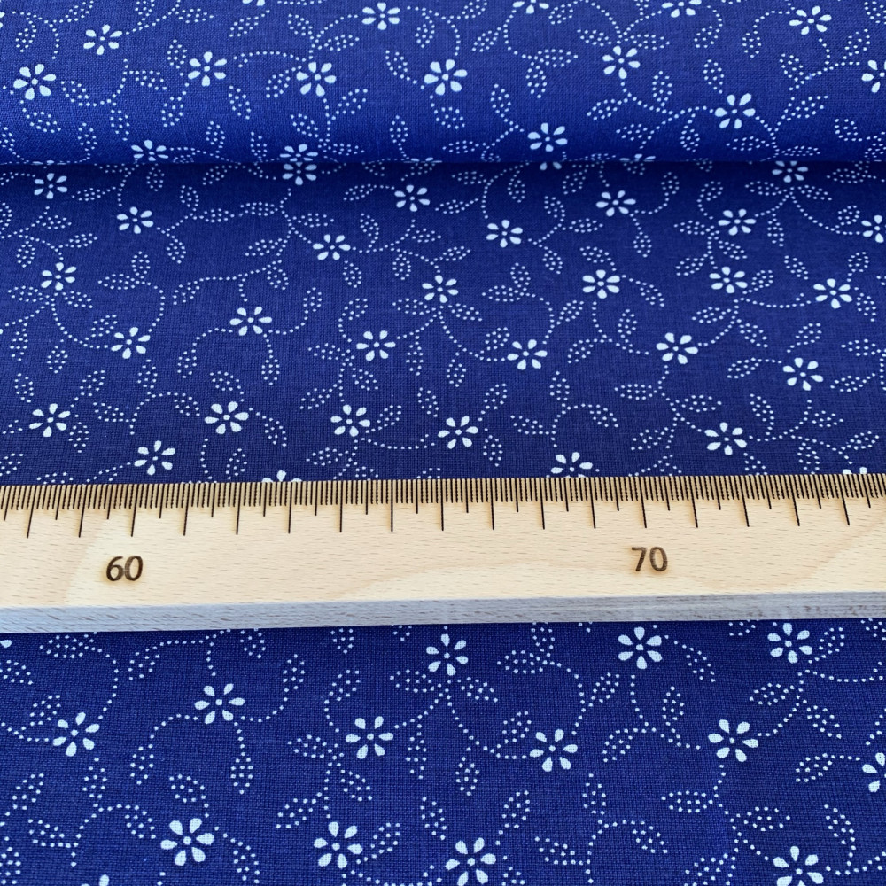 0,11 m EGYBEN KÉRHETŐ Indigókék alapon pöttyökből álló leveles, virágos kékfestő jellegű pamutvászon