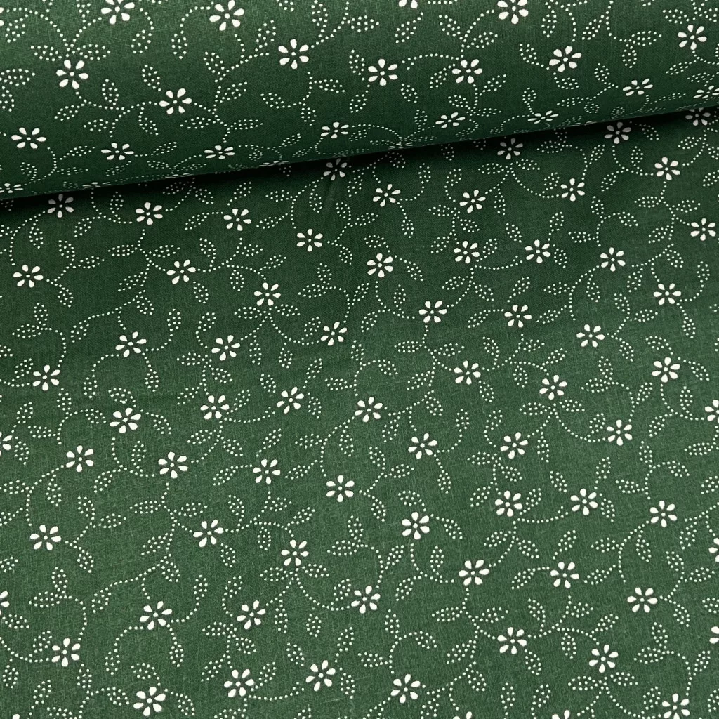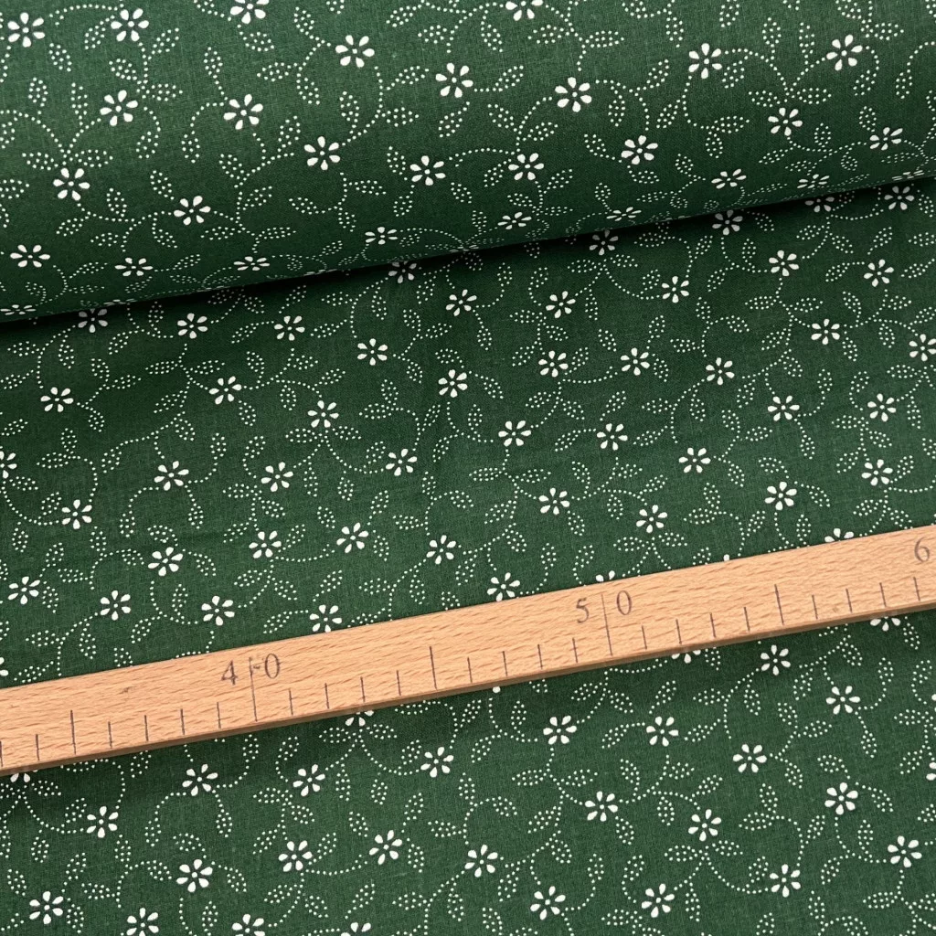 0,33 m EGYBEN KÉRHETŐ Zöld alapon pöttyökből álló leveles kékfestő jellegű pamutvászon