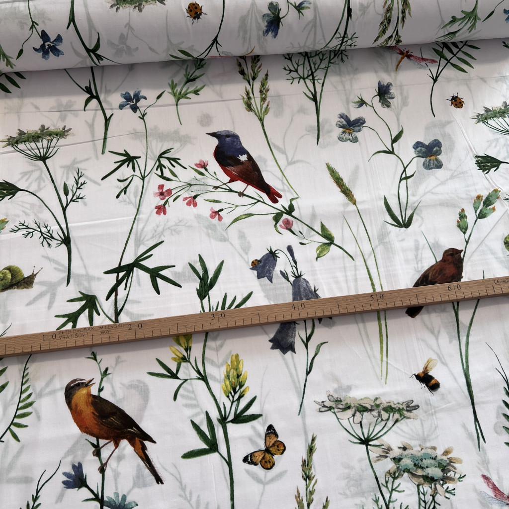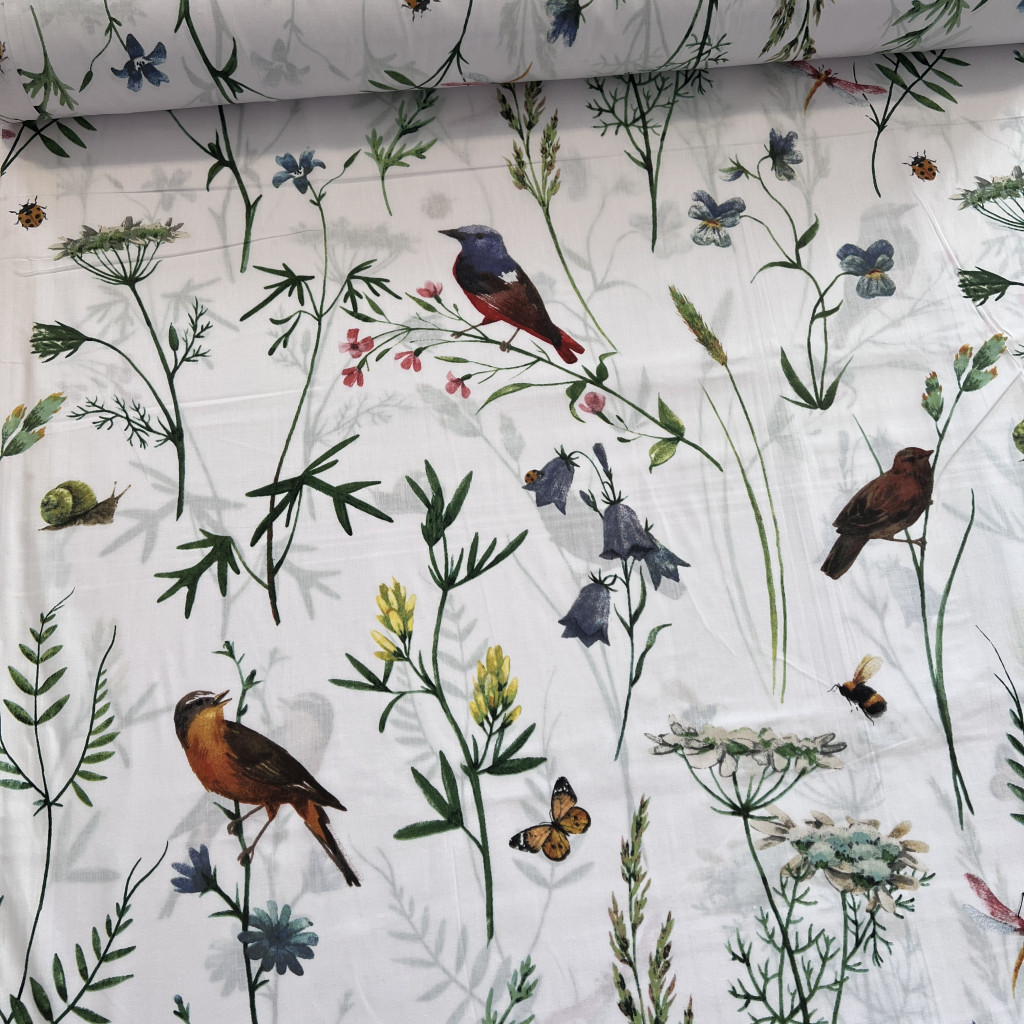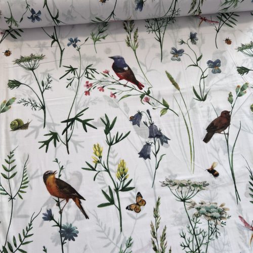 0,61 m EGYBEN KÉRHETŐ Fehér a. madarak és pillangók a kertben 160 cm sz. pamutvászon