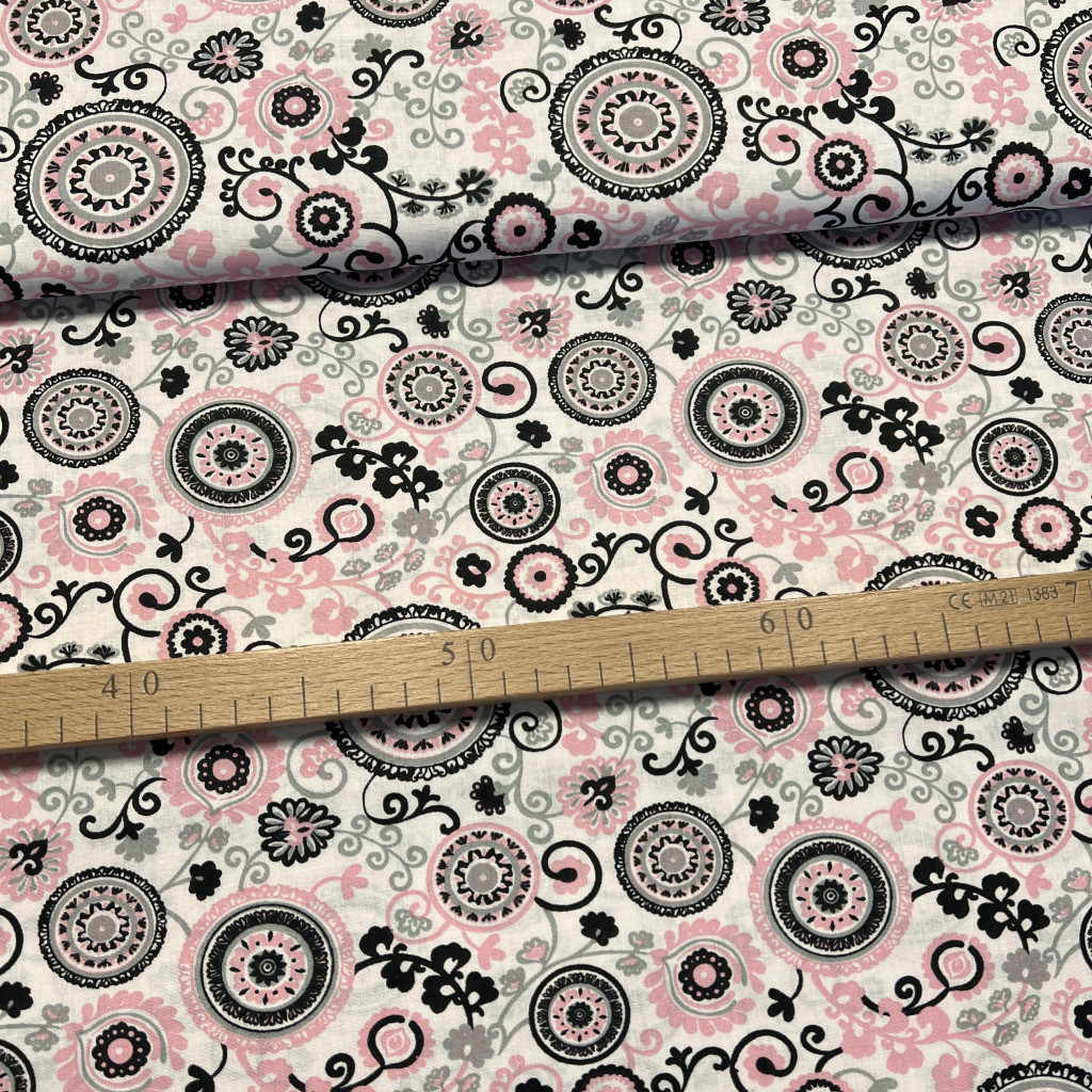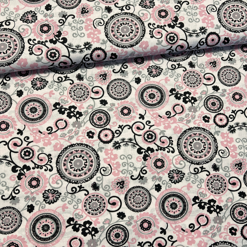 0,88 m EGYBEN KÉRHETŐ Fehér alapon rózsaszín-fekete mandalás pamutvászon