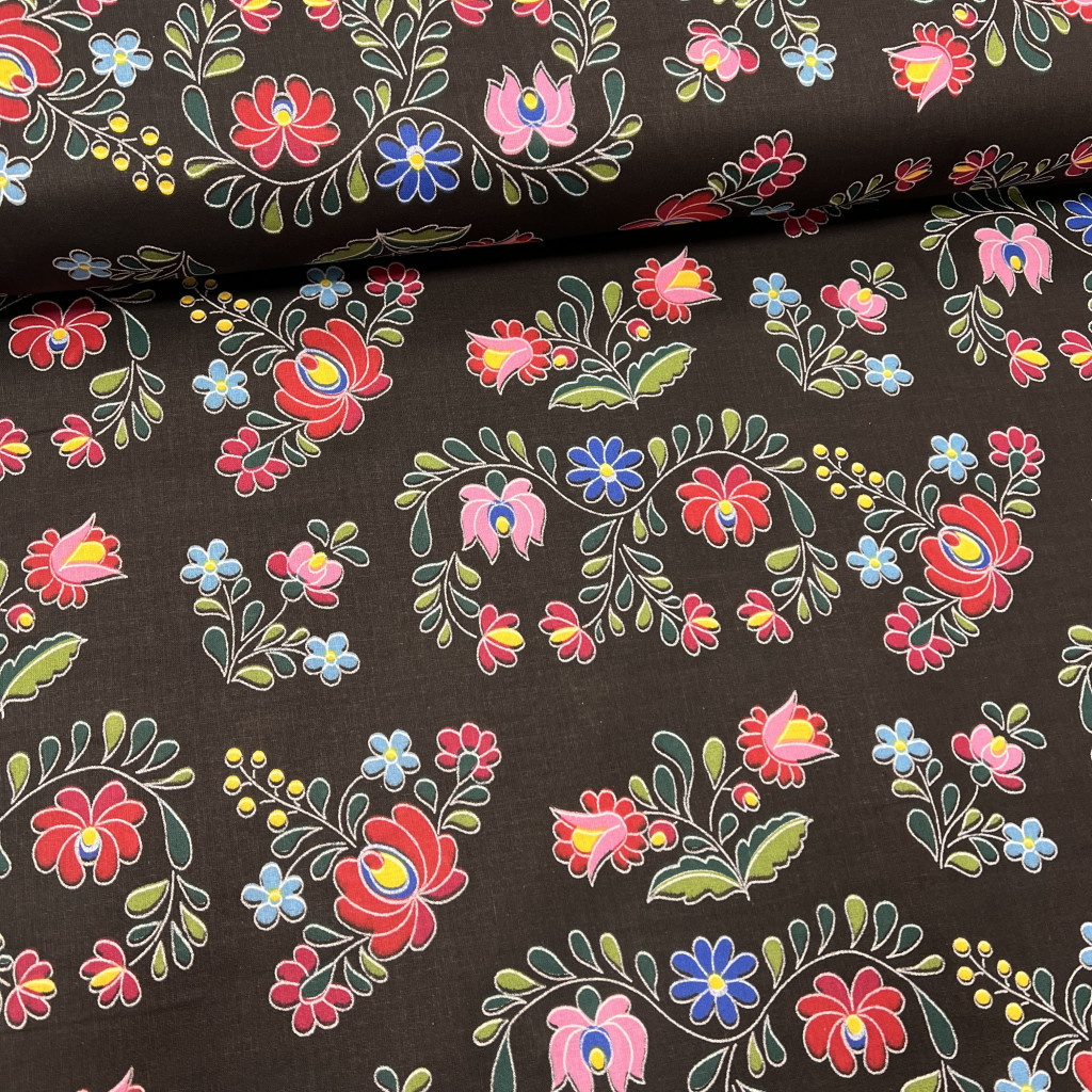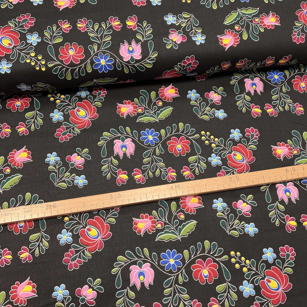 1,35 m EGYBEN KÉRHETŐ Fekete alapon kalocsai mintás pamutvászon (fehér szegélyes)