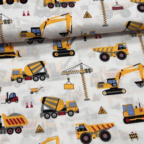 Fehér alapon sárga munkagépes 160 cm sz. pamutvászon