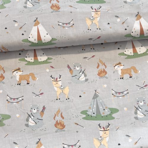 H. szürke alapon indián táborban őzike-maci-róka 160 cm sz. pamutvászon (KA)