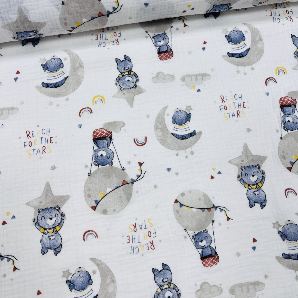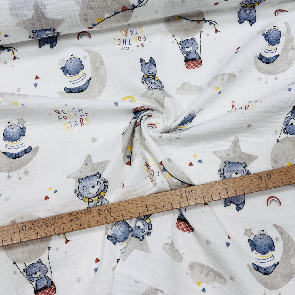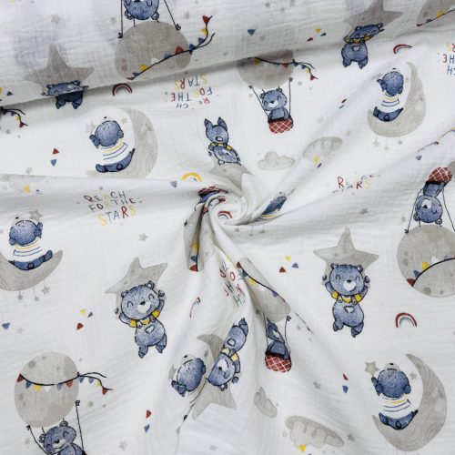 Dupla géz anyagaink 100% pamut összetételűek (140 cm szélesek). Az anyag nagyon puha és bőrbarát, hasonló a tapintása, mint a tetra pelenkának, csak ez még tömörebb és puhább. Vasalást nem igényel, mert alapból kicsit gyűrőttes hatása van. Mosás után könnyen szárad. Mosását max. 30-40 fokon ajánljuk, hogy ne menjen össze annyira. Akár 90 fokot is bír gond nélkül, ha nyálkendőnek használjuk, de ebben az esetben 10-15% zsugorodással kell számolni.